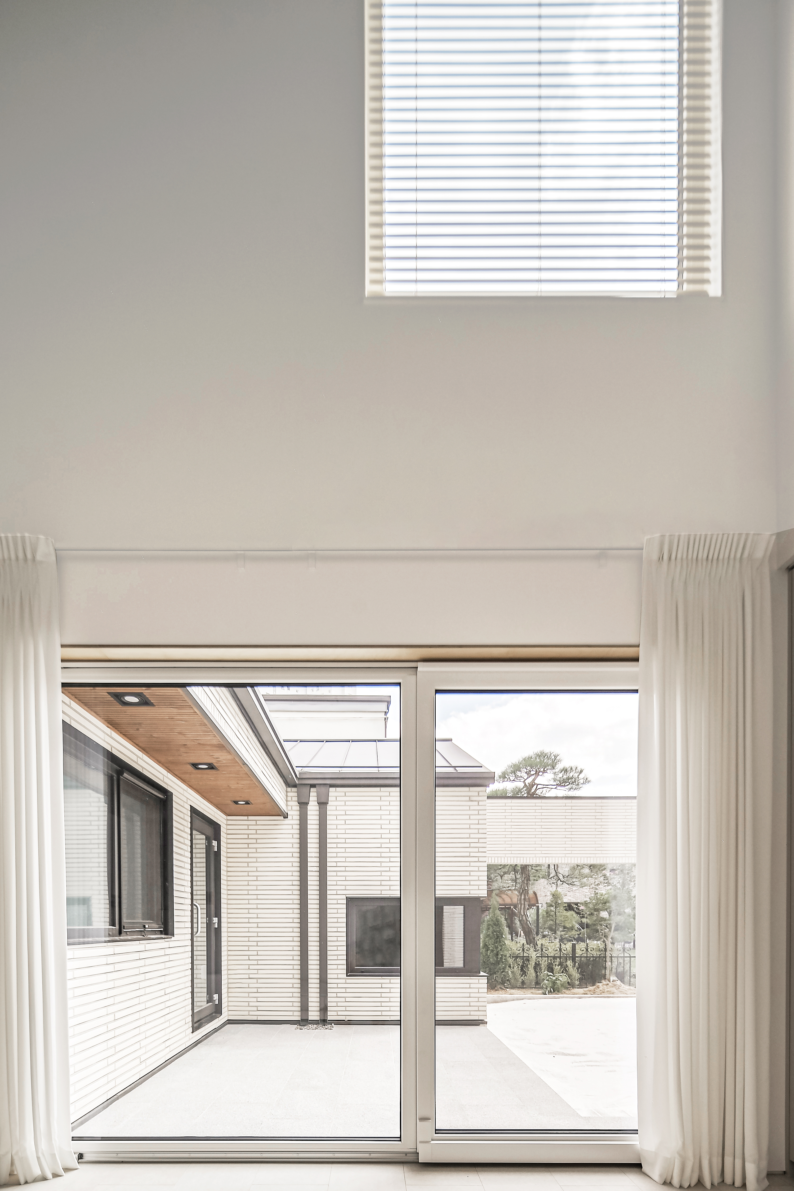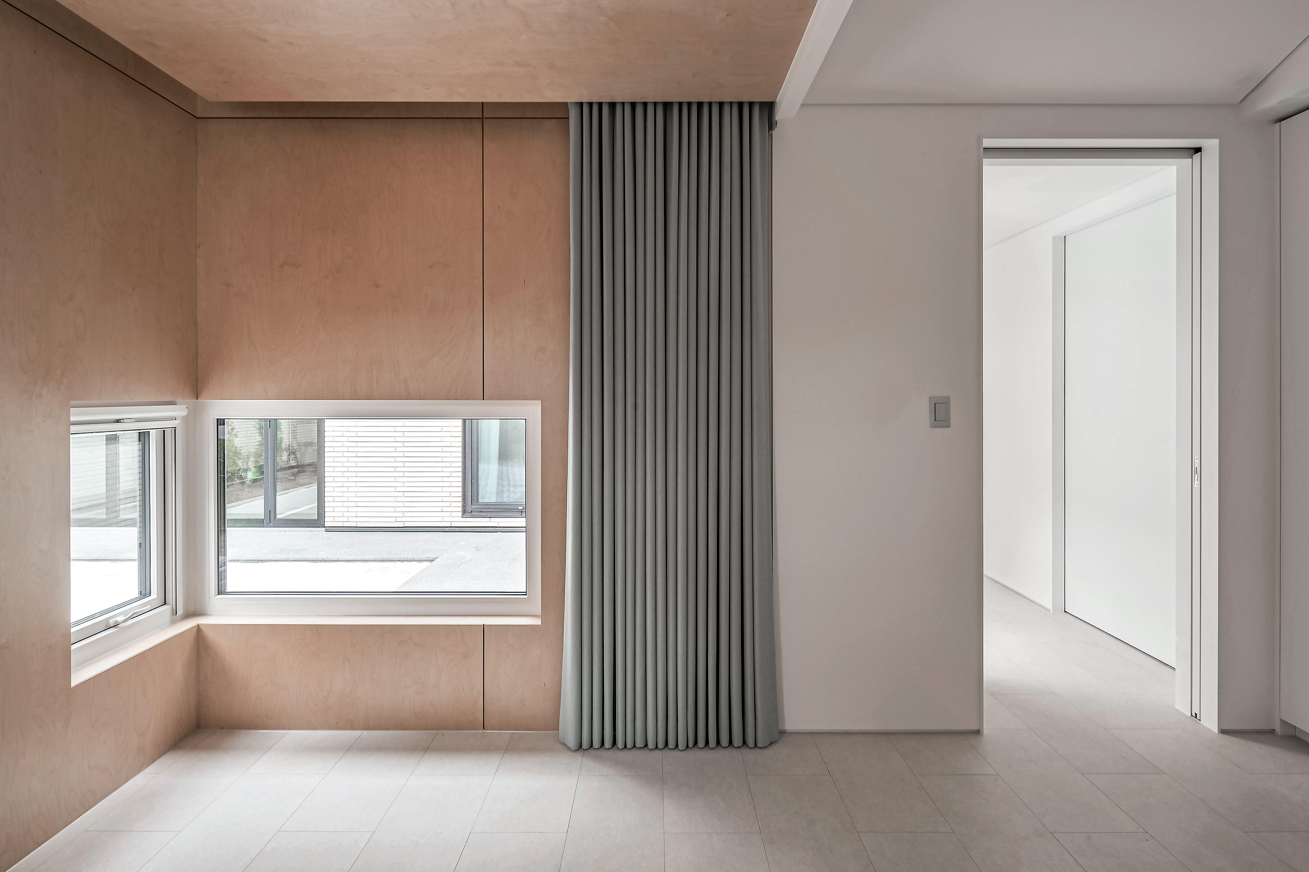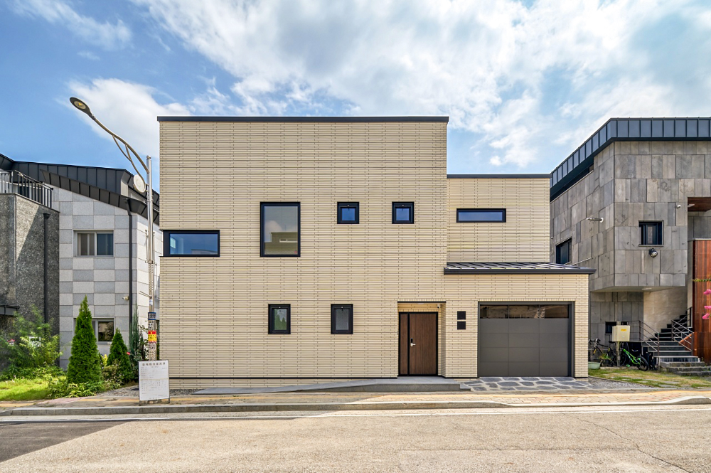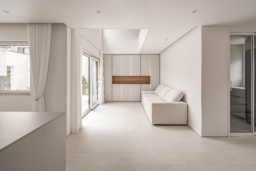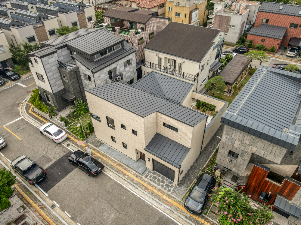 외장은 밝은 톤의 타일로 마감해 주변의 무채색 주택들과 대비되며, 지붕은 마당 쪽으로 낮춰 아늑한 실내 감각을 조성한다. 실내는 화이트톤 마루와 벽체, 우드 가구가 어우러져 절제된 따뜻함을 전한다.