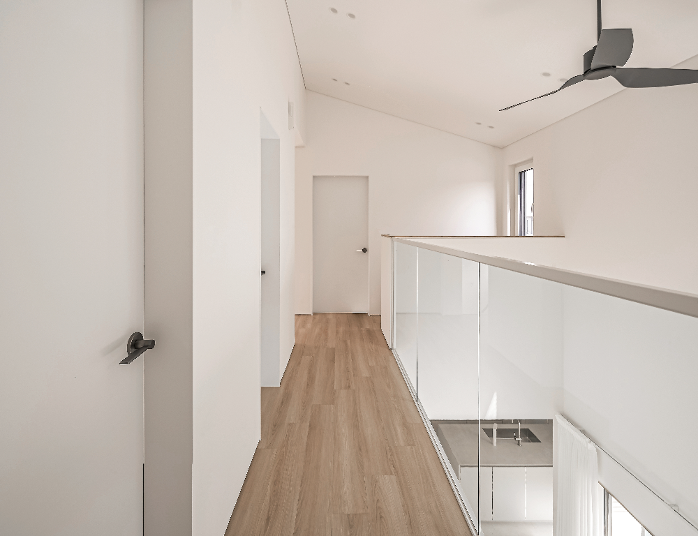 1층에는 거실, 식당, 주방이 순차적으로 배열되어 마당과 직접 연결되며, 높은 천장과 오픈된 시야는 공간을 실제보다 넓게 느끼게 한다. 복도에는 포켓도어와 창을 적극 활용해 시선을 확장했고, 2층은 방들이 유리난간과 복도로 느슨하게 연결되어 세대 간 소통을 이어준다. 건축주의 재택근무를 고려한 작업실, 넓게 계획된 욕실과 건식 세면 공간 등은 실제 생활의 리듬을 반영한 구성이다.
